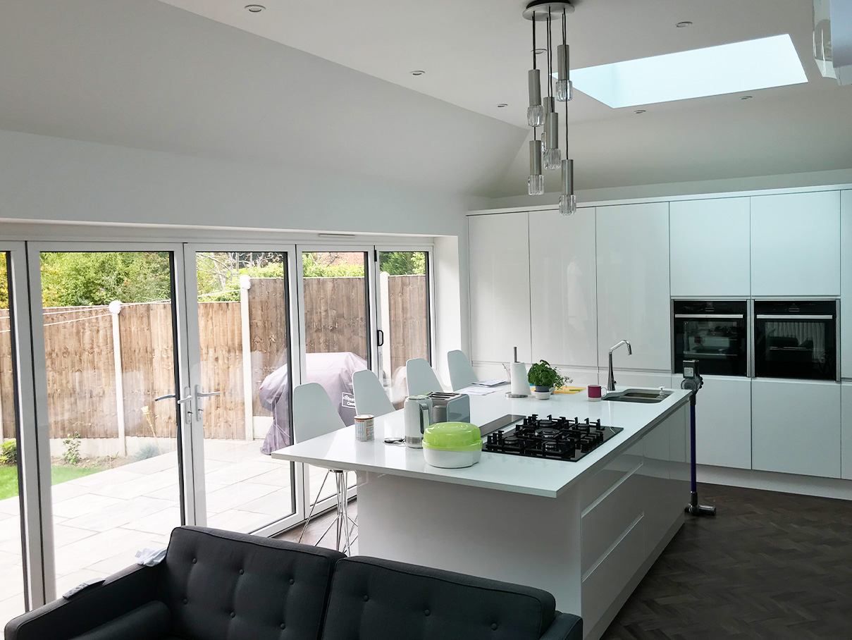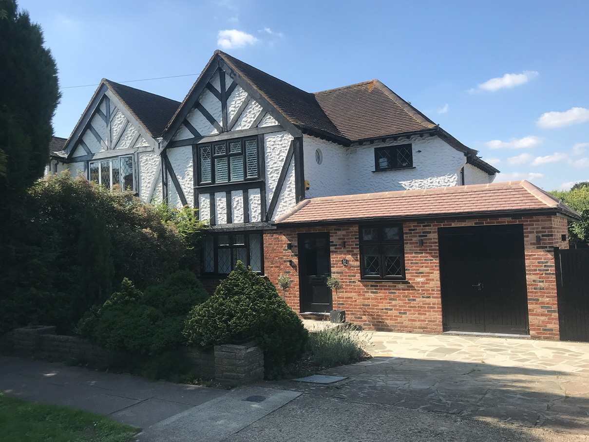 This project at Priory Avenue in Petts Wood, Kent, involved a carefully planned double-storey side extension and a single-storey rear extension, along with external improvements such as a new resin-bound driveway, garden walls, and a patio.